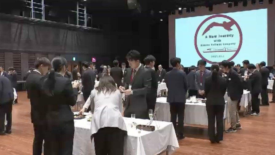 JR九州では「ウェルカムパーティー」と題して立食パーティー形式での「内定式」を行っていて、内定者は現役社員らと交流を深めました。