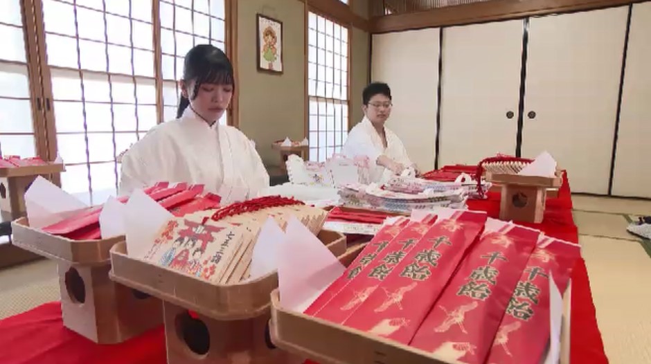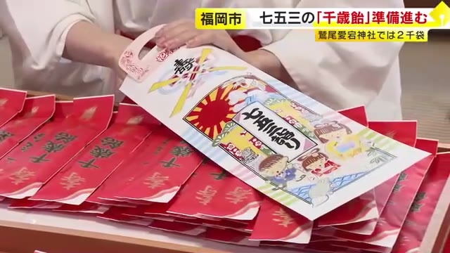 福岡市西区の愛宕神社では1日、神職と巫女の2人が七五三用の千歳飴の袋詰めを丁寧に進めました。