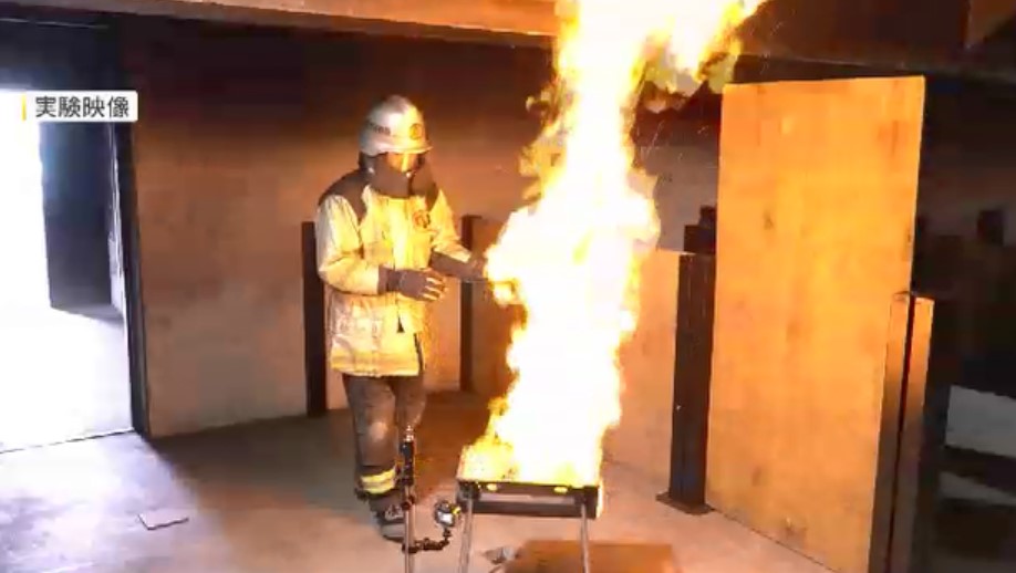 実験ではアルコールをコンロに注ぎ入れると火が大きく燃え上がり、消防隊員の背丈ほどの高さまで上りました。