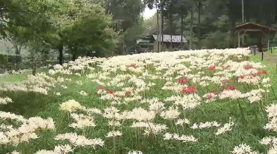 この白い彼岸花は70年ほど前に寺の一角に植えられ、付近の住民が世話を重ねるうちに数が増え、今では境内いっぱいに咲き誇っています。