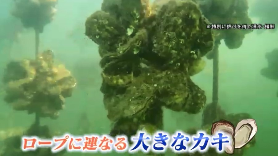 カメラを持って水中に入った記者の前に現れたのはロープに連なった大きなカキ。