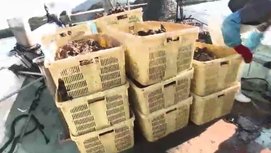 引き揚げ始めて約1時間で、船はカキが入ったケースで埋め尽くされるほどに。