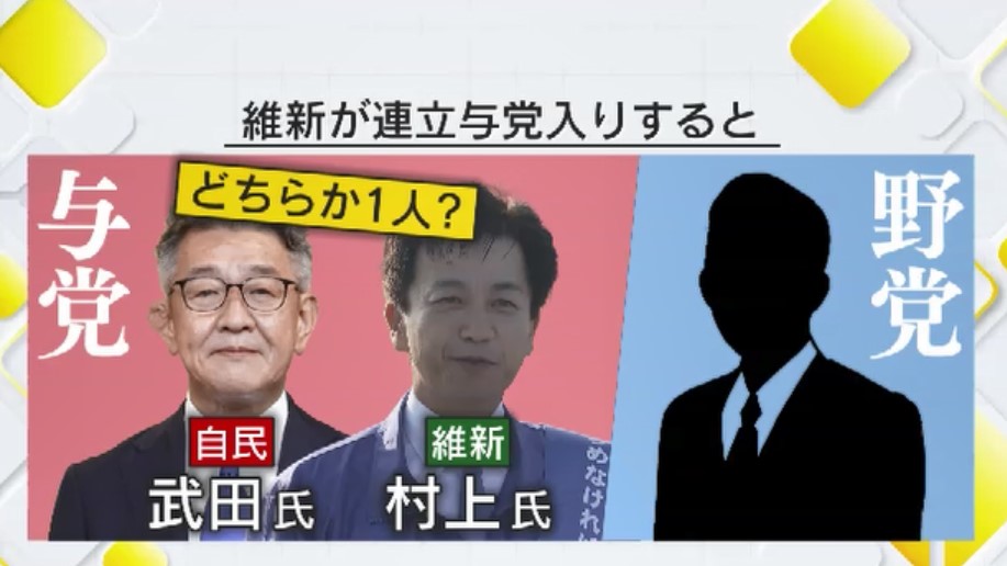 しかし維新が連立入りした場合、次の選挙では、与党としての候補が、自民の武田氏と維新の村上氏のどちらか一方に絞られる可能性が出てくるのです。