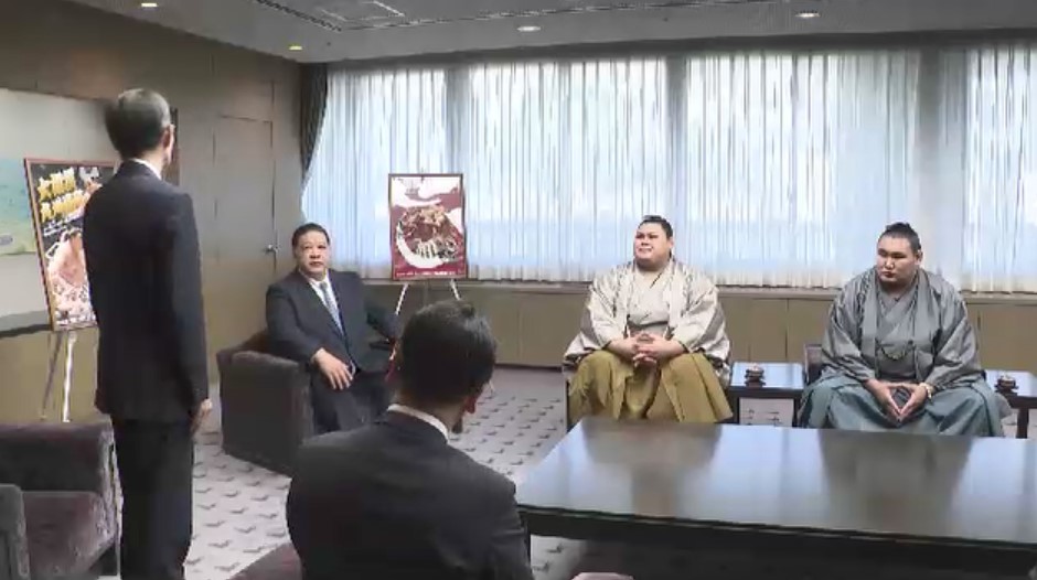 福岡市役所を訪れたのは、横綱大の里と豊昇龍、そして九州場所の担当部長を務める元大関魁皇の浅香山親方の3人です。