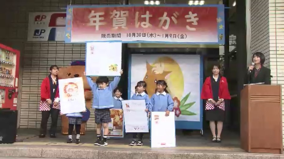地元の園児たちが精いっぱい腕を伸ばして紹介しているのは来年用の年賀はがきです。