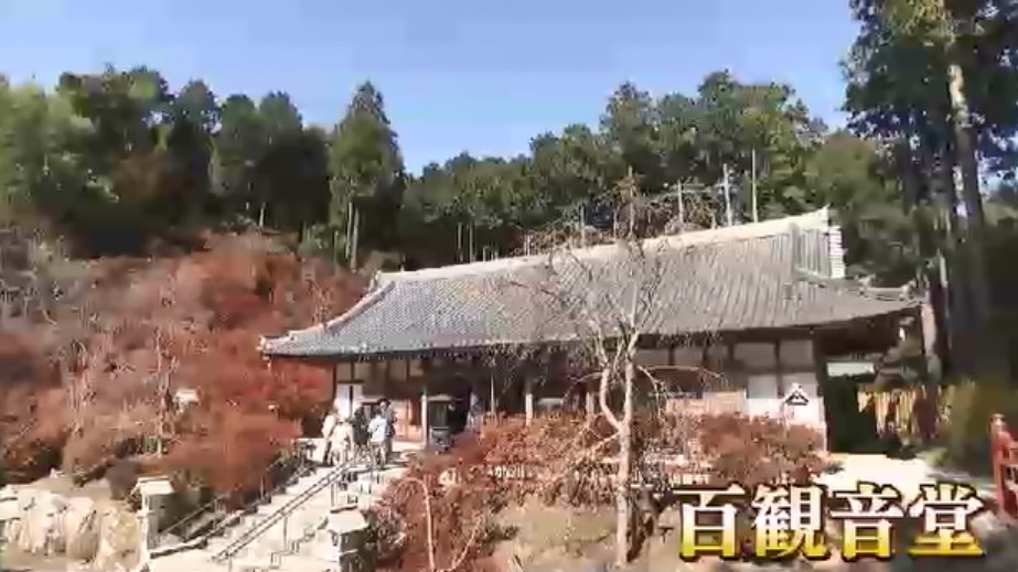「呑山観音寺・天王院の参道にやってきました。見上げるとモミジが赤く色付き始めています」