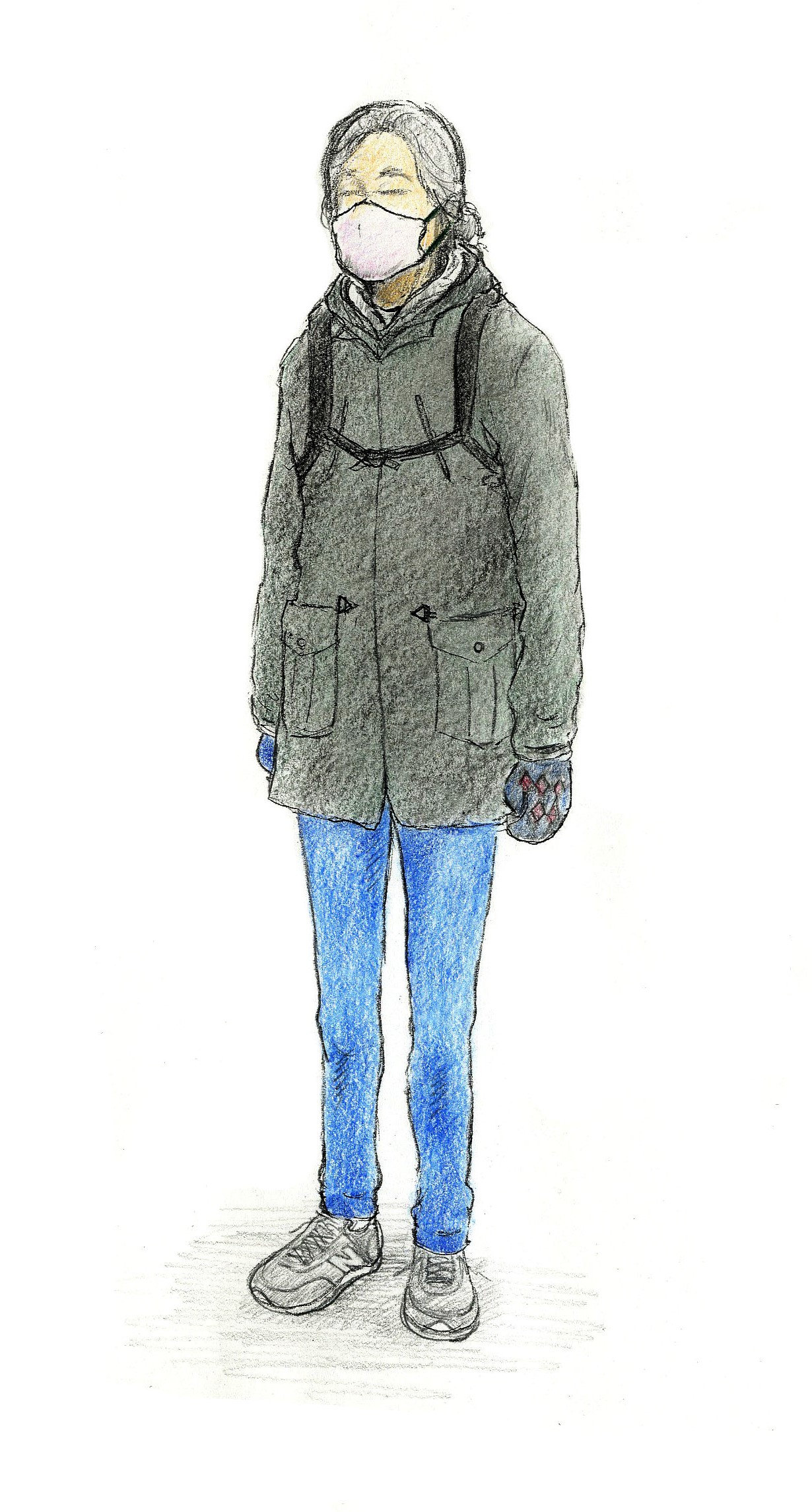 ▽紺の長ズボン、ニューバランスの灰色運動靴