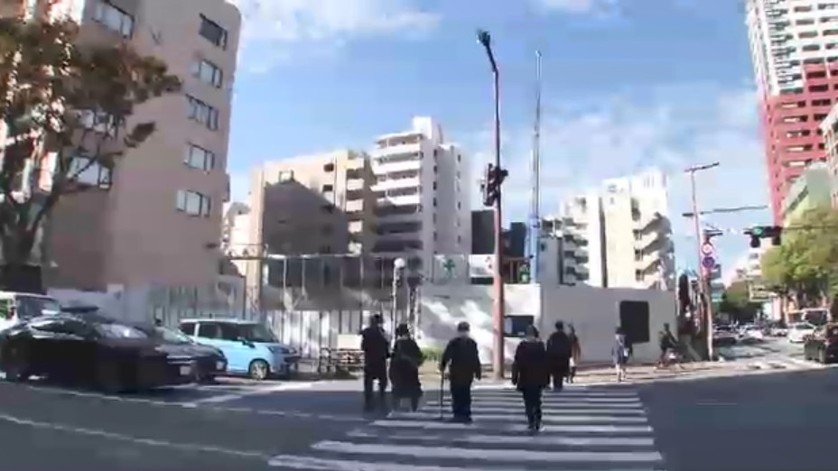 「中央区警固の交差点に来ました。巨大なクレーン者も今動いていますね。この超一等地に今、高層タワーマンションが建設中なんです」