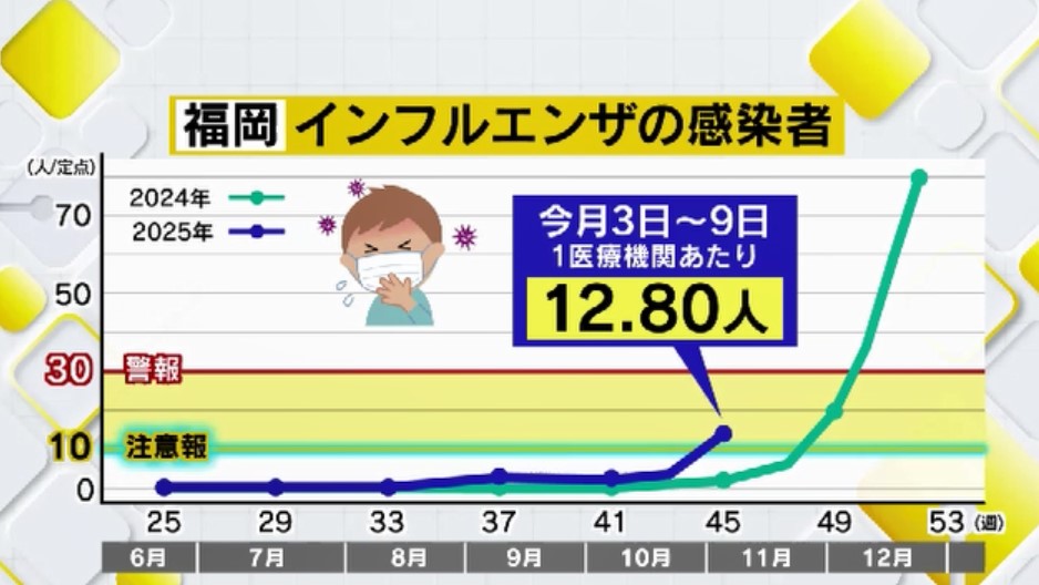 福岡県によりますと、11月3日からの1週間の1医療機関あたりのインフルエンザの感染者数は12.80人。