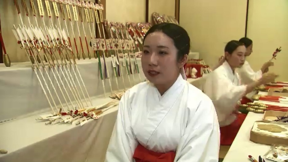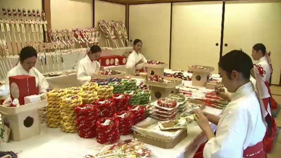 太宰府天満宮で始まった縁起物の準備では、6人の巫女たちが飾り付けや袋詰めなどの作業を丁寧に進めていました。