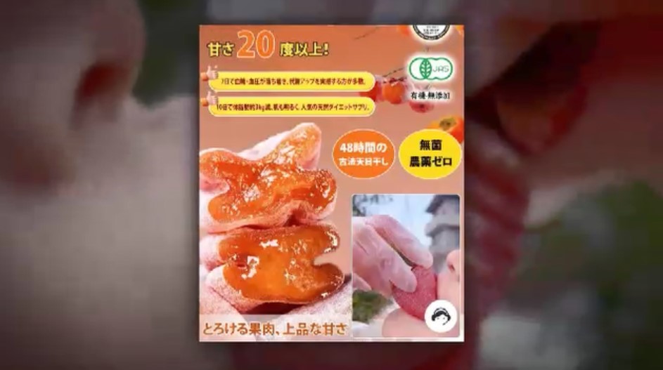 広告では女性が柿をむいたり頬張ったりと、「福岡県産」の干し柿の美味しさを宣伝しています。