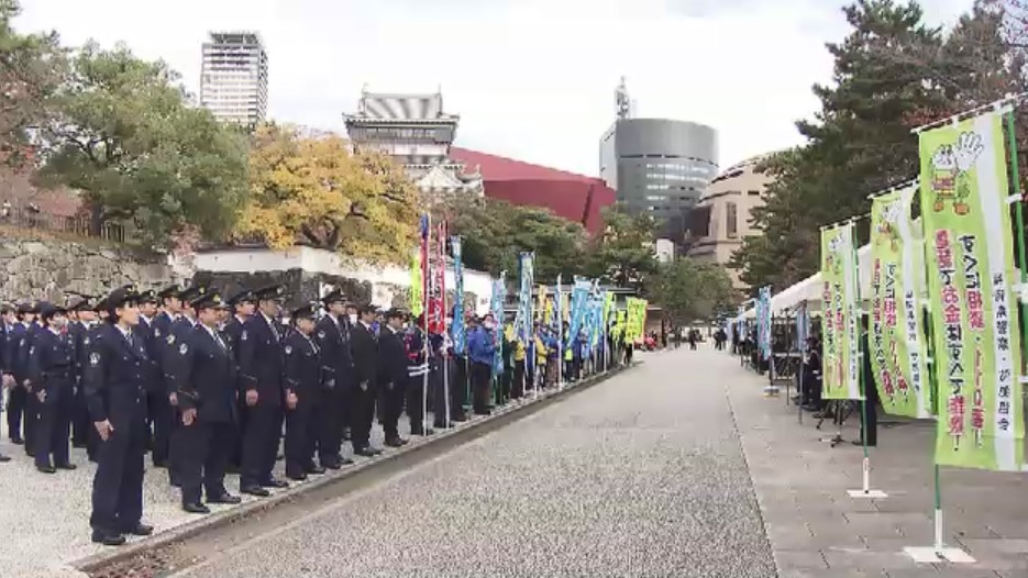 北九州市の小倉城前広場で行われた特別警戒の出動式には、警察や地域の住民など約500人が参加しました。