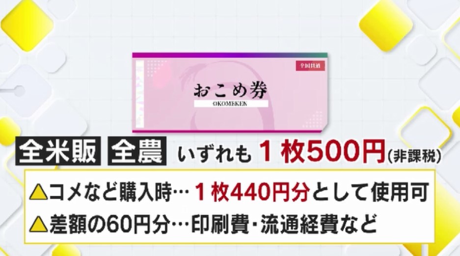 そもそも、おこめ券は全米販やJA全農が発行しているもので、1枚500円で購入した場合、経費として60円引かれ、440円分の米を購入できるというものです。