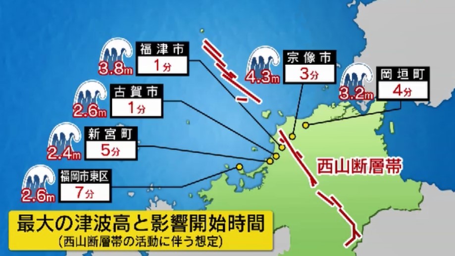 西山断層で想定される最大の津波の高さと影響開始時間をみると、福岡市東区では7分、新宮町では5分、福津市や古賀市ではわずか1分で水位が20センチ上昇するとされています。