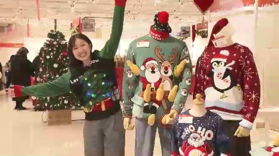 「メリークリスマス!このニット、ツリーの柄が実際に光ります。おもしろい、浮かれちゃう。見せて歩きたくなります」