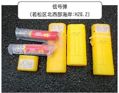このほか、医療廃棄物や海難救助に用いる信号弾なども日本海沿岸に漂着しているのが報告されていて、市によりますと2016年2月に若松区の海岸で注射針付き注射器や信号弾が発見されているということです。