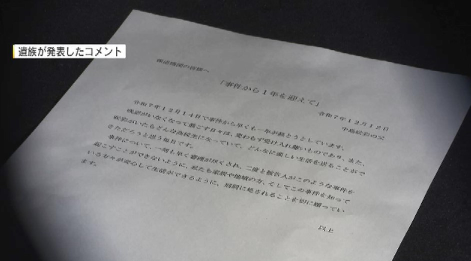 12日、亡くなった女子中学生の遺族がコメントを発表しました。