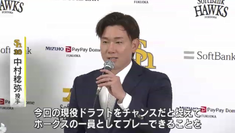 プロ野球の現役ドラフトで福岡ソフトバンクホークスが獲得した中村稔弥投手が、新天地での会見で意気込みを語りました。
