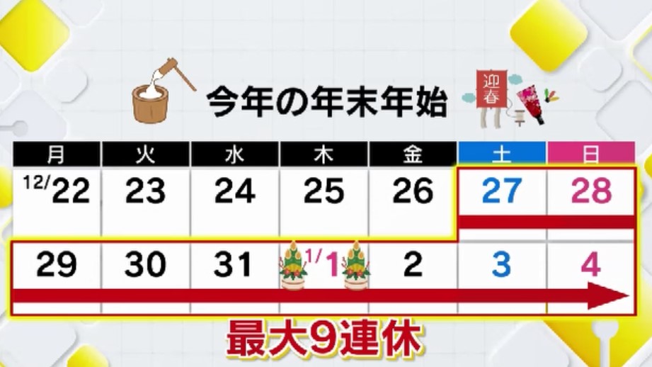 今度の年末年始は最大で9連休となり、帰省や旅行に出かける人も多くなりそうです。