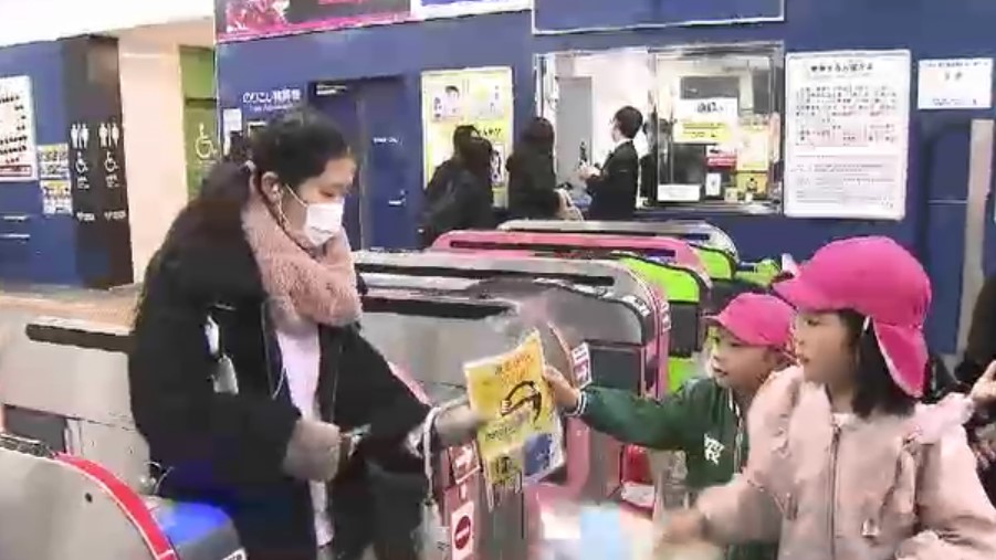 点灯式のあと、園児たちは飲酒運転の撲滅を呼びかけるチラシや啓発グッズを駅の利用者に配りました。