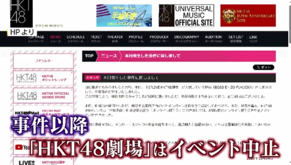 しかしこの事件以降、HKT48劇場は握手会などのイベントを中止し、男性が楽しみにしているクリスマスイベントも控えていますが、開催されるかどうかまだ分かっていません。