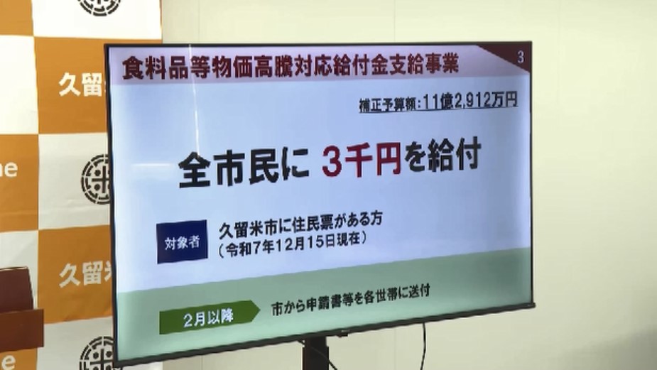 久留米市(福岡県)は、政府が物価高対策として推奨している「おこめ券」の配布を見送り現金3000円を支給する方針を明らかにしました。