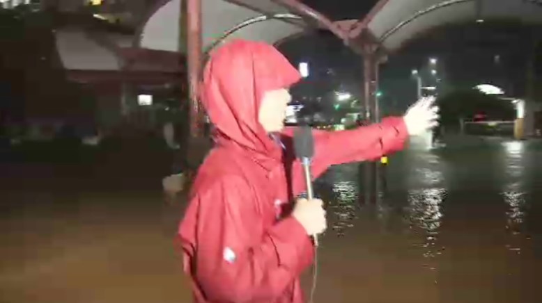 「宗像市のJR赤間駅です。駅の入口付近まで冠水が迫っています」。記者が伝えた現場では駅のロータリーが完全に水没し、車が動かせなくなって徒歩での帰宅を余儀なくされる人々の姿がありました。