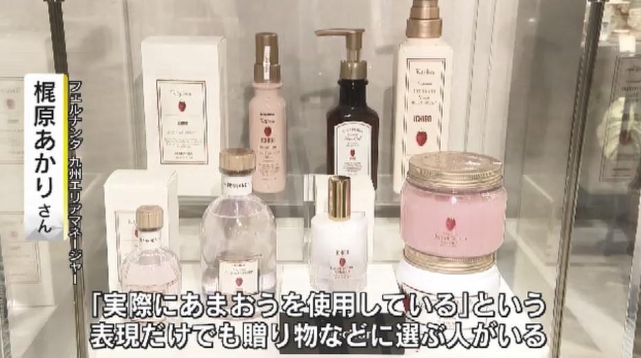 「福岡市のフレグランスショップでは、店の一番目立つところにイチゴシリーズが並べられています。こちらに使われているのが白木のいちごのあまおうなんです」