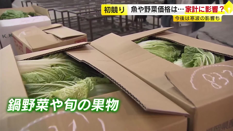 一方、北九州市の市場では、ハクサイやネギといった“鍋野菜”や旬を迎えたミカンやイチゴなどの果物が初セリの目玉となりました。