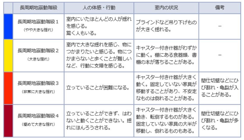 長周期地震動は階級1から階級4まであり、以下の通りとなっています。