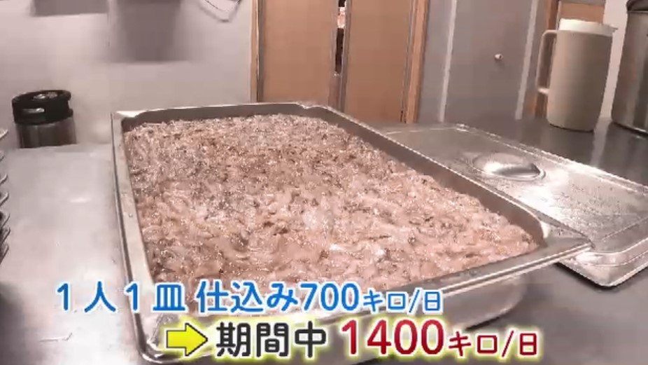 1人1皿では1日700キロだった塩辛の仕込みを、今回の期間中は倍の1400キロで対応しているといいます。