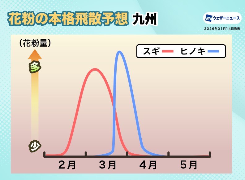 ウェザーニューズによりますと九州で花粉の飛散が始まるのは2月上旬から中旬にかけてで、スギ花粉の本格的な飛散は2月中旬以降と見込まれていますが、気温が高い状態が続くと開始直後から本格的に飛散する可能性があります。