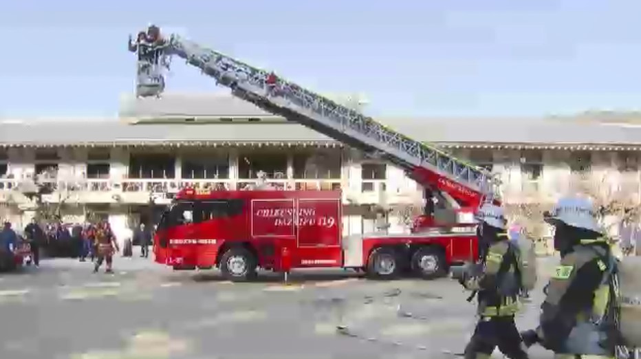 太宰府天満宮の境内で行われた消防訓練。
