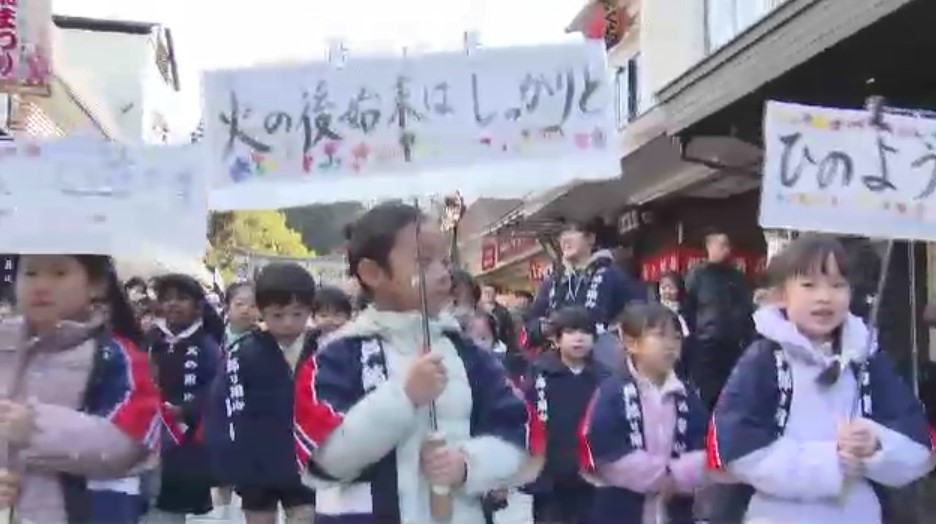 訓練の後は、境内にある幼稚園の園児たちがパレードを行い、参道で働く人や観光客に火災への注意を呼びかけました。