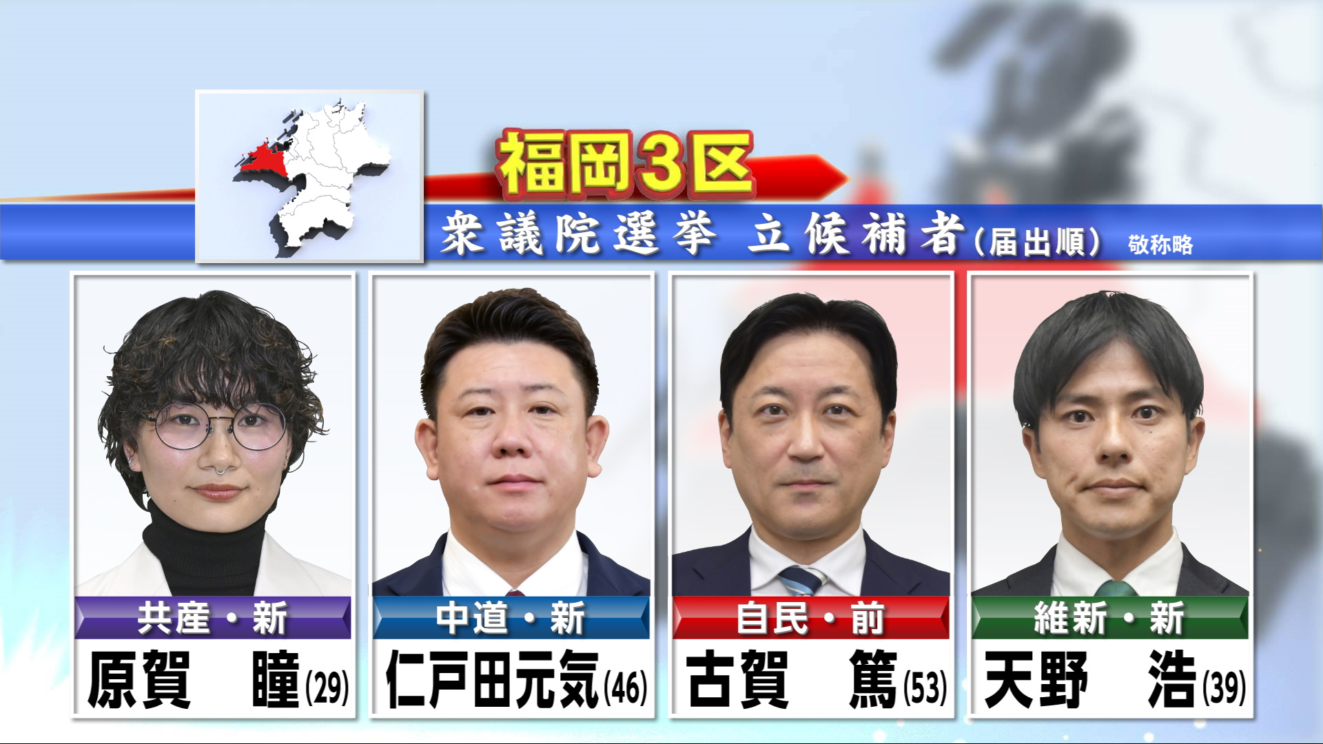 福岡3区の立候補者は以下の通りです(届け出順、敬称略、年齢は27日時点)。