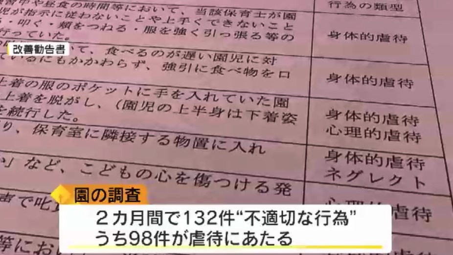 また園が行った調査では、去年7月からの2カ月間で132件の「不適切な行為」があり、そのうち98件が虐待にあたるものだったということです。