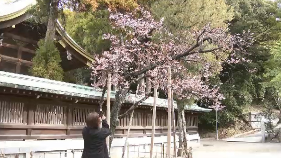淡いピンクの花びら揺れる…「開運桜」が見ごろ 5日の県内は3月下旬並みの気温に 福岡・宮地嶽神社