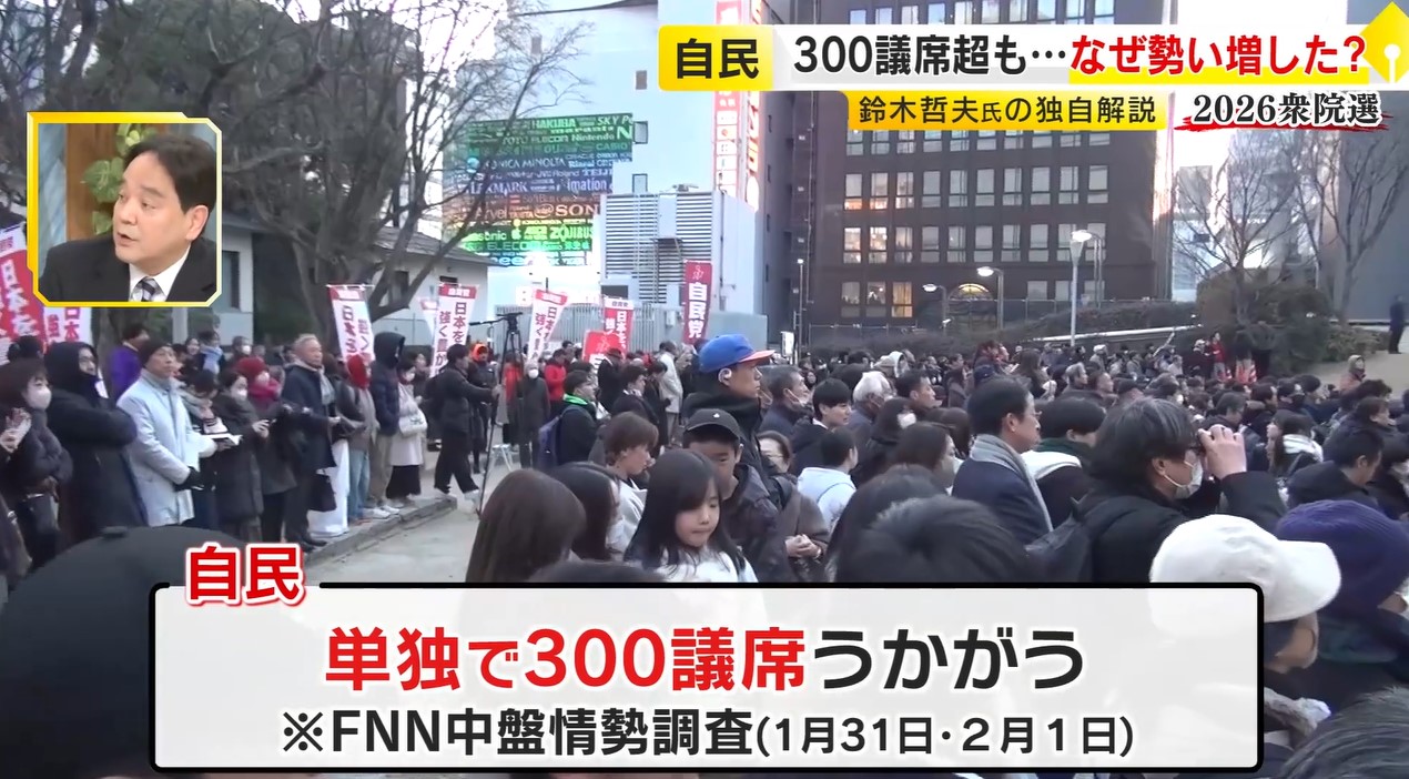 この前の土日に行われた FNNの中盤情勢によると、自民党が単独で300議席をうかがうかという状況となっています。選挙戦で自民党が勢いを増したのはどうしてでしょうか。
