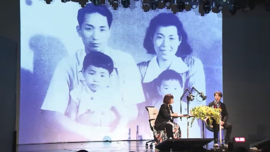 わたせさんは、幼少期を過ごした北九州市での思い出を写真と共に振り返り、絵画教室でリンゴの絵を何度も繰り返し練習した制作活動の原点について語りました。
