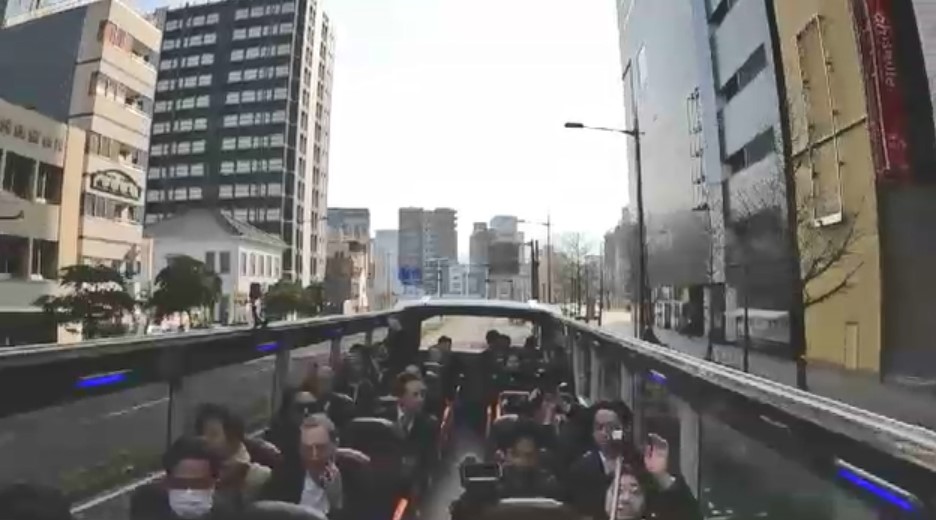 「オープントップバスの試乗をしています。目線の高さは3.3メートルということで道路標識や信号に手が届きそうな高さです」