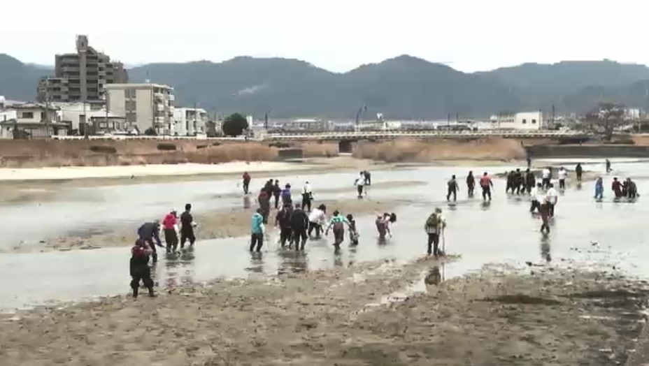 「福岡市西部を流れる室見川です。まもなく干潮時間を迎え水位が低くなる中、大勢の人が川の中に入っています」