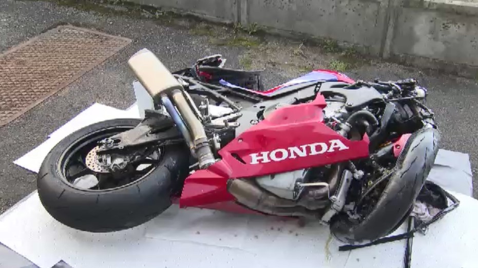 「こちら事故を起こした車です。正面のガラスが大きく割れているが側面に回るとドアも大きくひしゃげていて衝撃の大きさが伝わります」