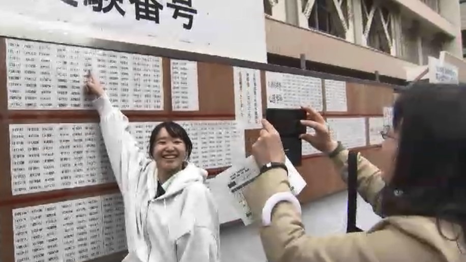 福岡市早良区の西南学院大学では、前期日程の合格者の受験番号が張り出され、番号を見つけた受験生たちは友人や家族とともに喜びを分かち合っていました。