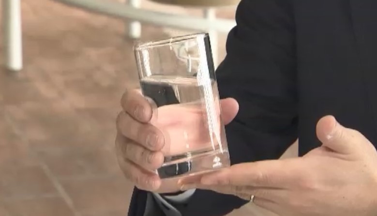 「こちらが海水からできた水です。無色透明です。いただきます。塩辛さもなく、水道水となんら変わらない味です」