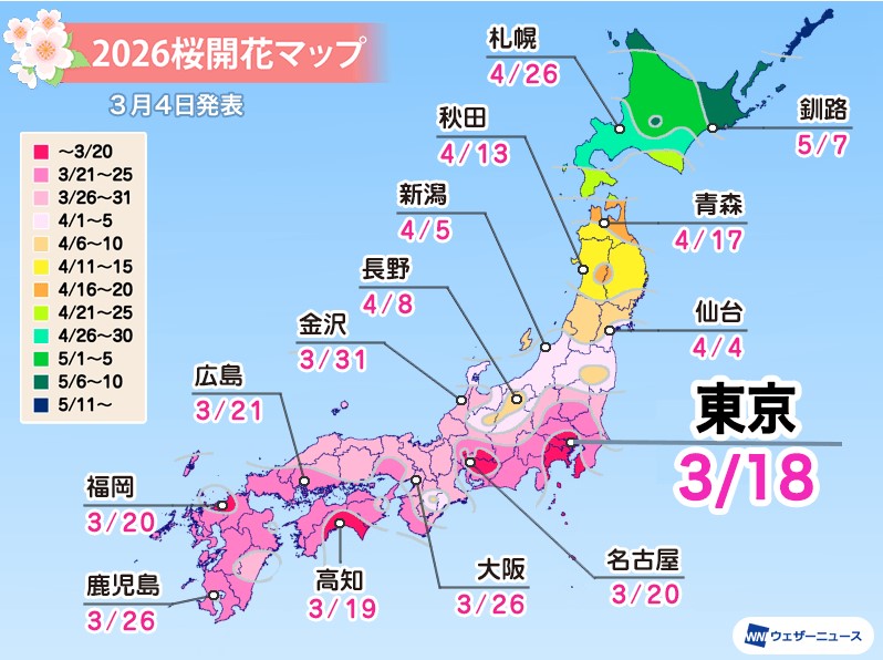 ウェザーニューズは4日、2026年の「第5回桜開花予想」を発表しました。