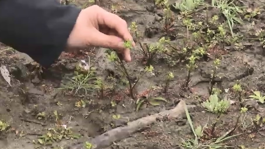 「ダムの底には緑が生い茂っています。太陽に照らされている時間が長いからでしょうか、この草は蕾が出てきていますね」