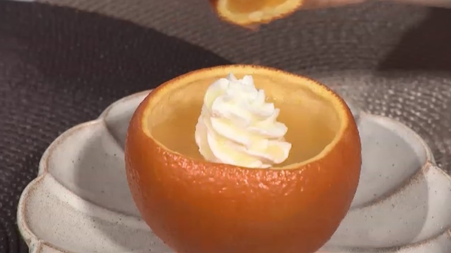さらに、オレンジの皮を器にしたゼリーはホイップクリームを添え、蓋に残った果汁を搾るとよりジューシーな味わいが楽しめます。