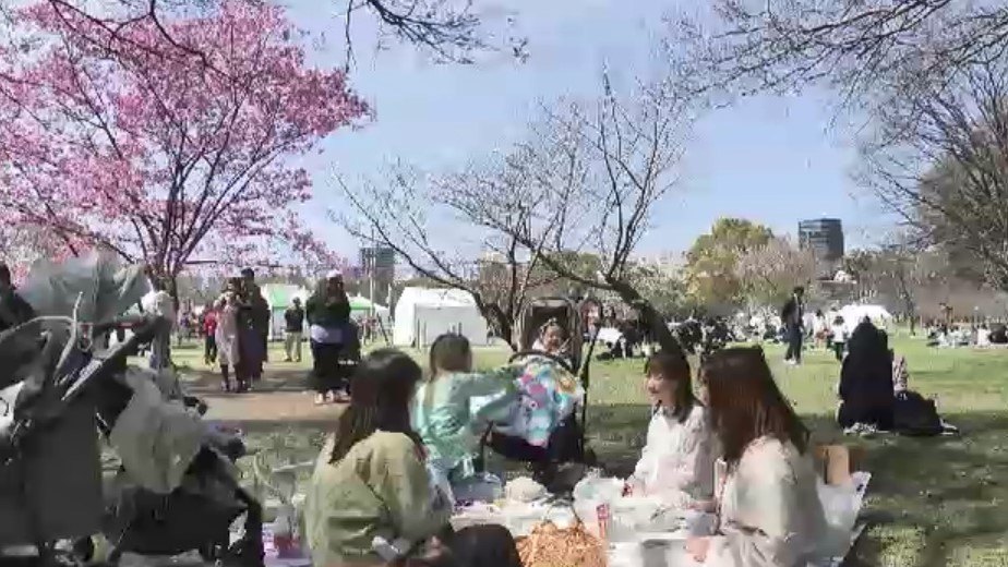会場では咲き始めたソメイヨシノが彩り、少し早めに開花する鮮やかなピンク色の「ヨウコウ」は満開になったものもあり、青空の下多くの人でにぎわっていました。