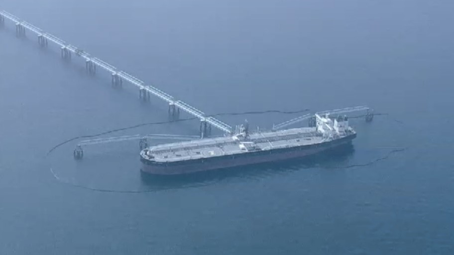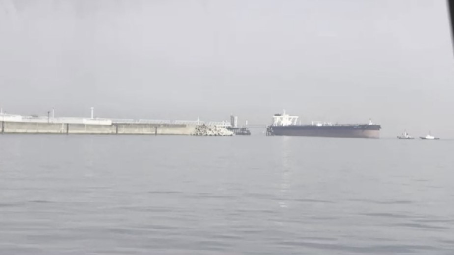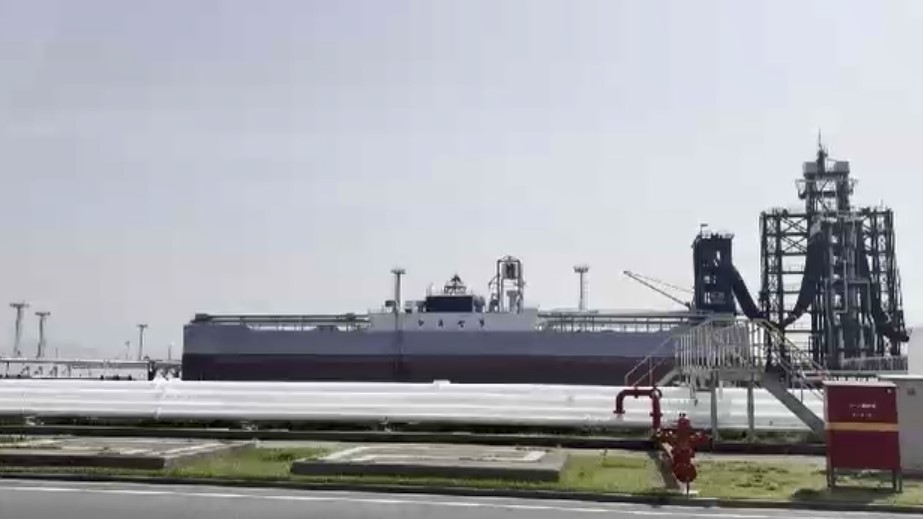 「画面奥に巨大なタンカーが到着しています。これから石油放出の準備が行われます」