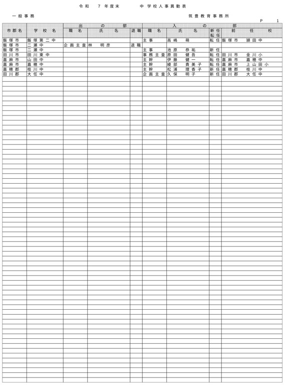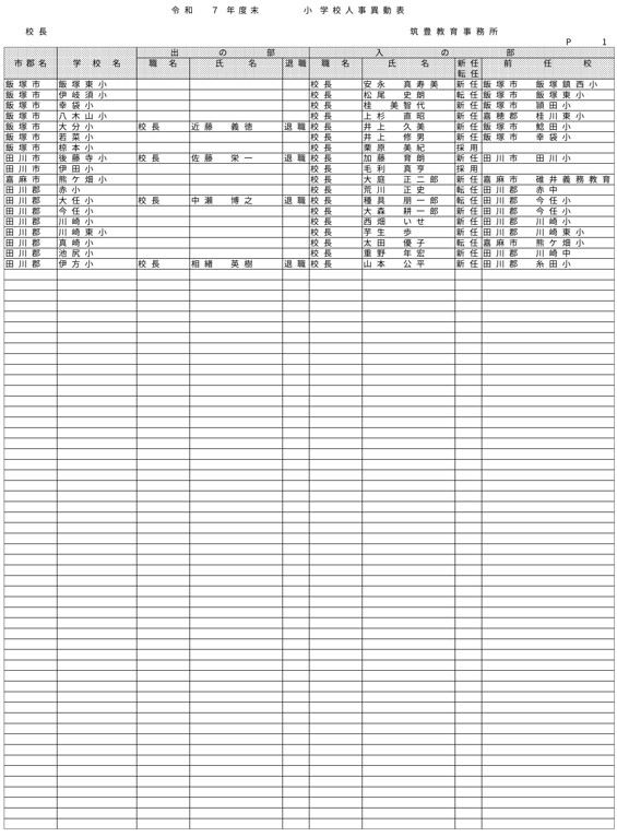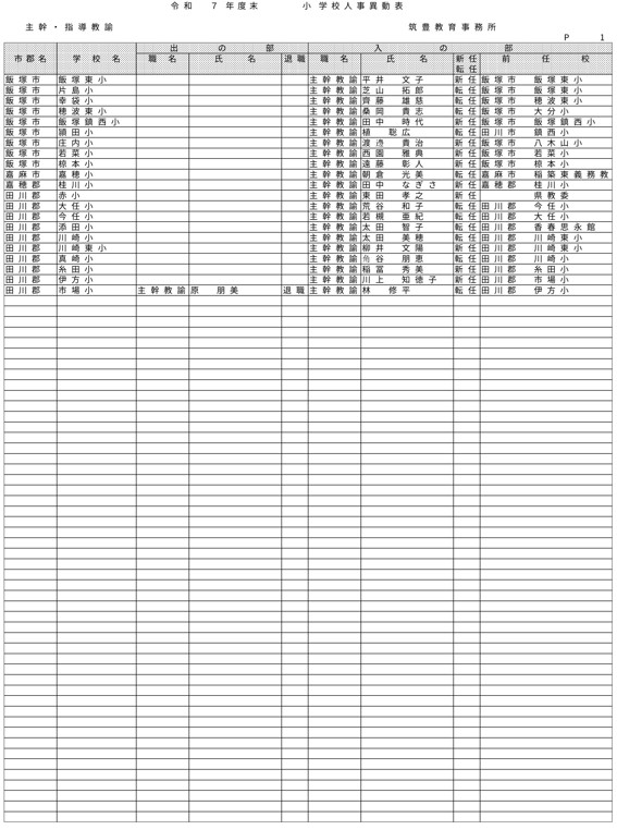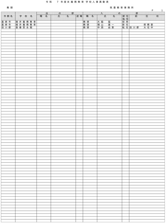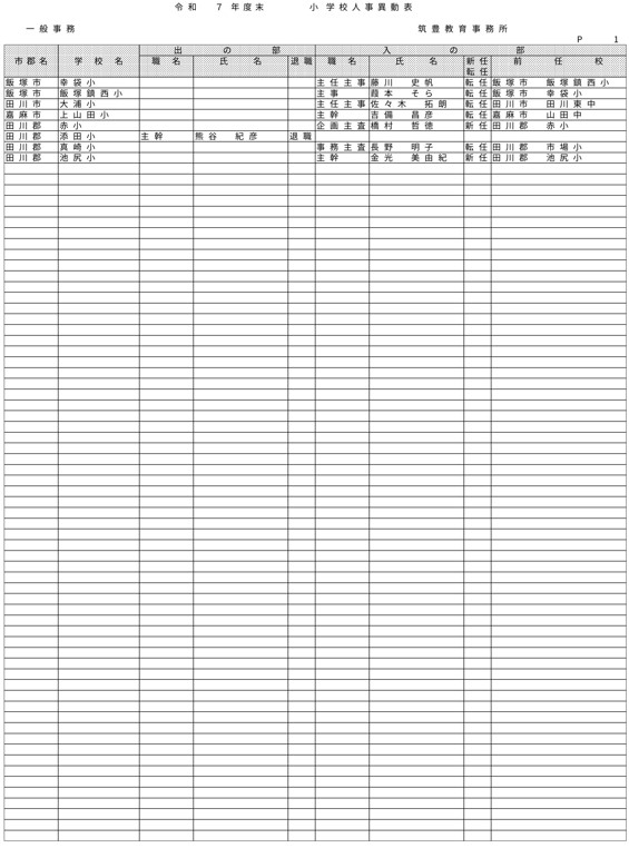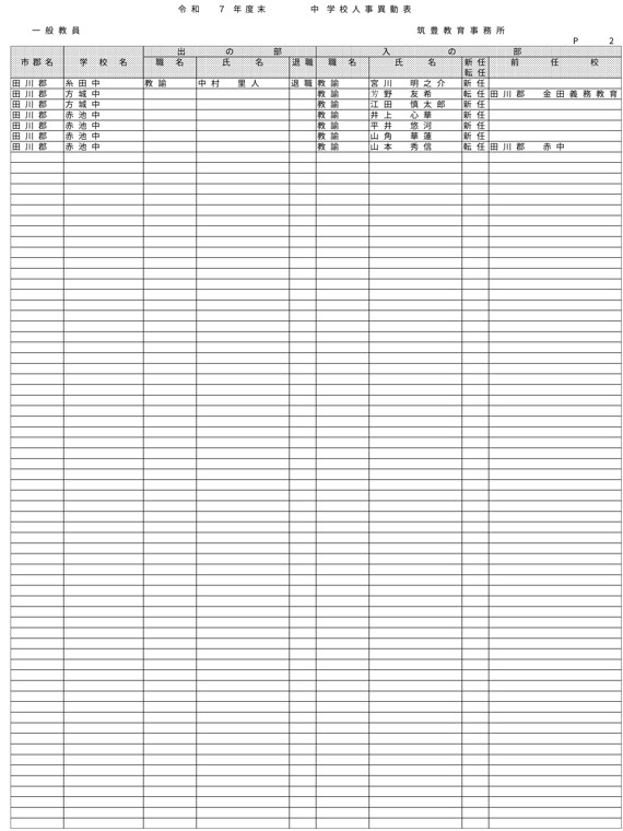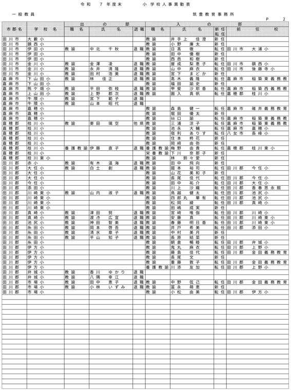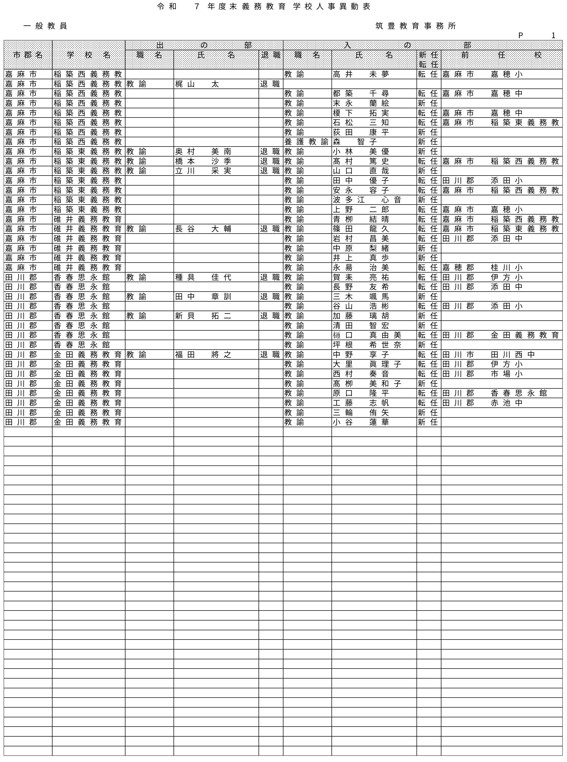 HOME 【全掲載】福岡県教職員の人事異動(5)あの先生はどの学校に?(筑豊教育事務所/小・中・義務教育学校) 【全掲載】福岡県教職員の人事異動(5)あの先生はどの学校に?(筑豊教育事務所/小・中・義務教育学校) 政治・行政 23時間前 福岡県教育委員会は県立学校や政令市を除く市町村立学校などに勤務する教職員の人事異動を発表した。異動の規模は市町村立学校が3833人、県立学校等(県立中学校と県立中等教育学校含む)が1292人、県教委事務局が71人の計5196人で、前年度より955人減っている。詳細は以下の通り(一部を除き、画像ファイルにて掲載)。 衆院選 実録TNC報道部 事件 気象・災害 ホークス アクセスランキング ACCESS RANKING アクセスランキング一覧へ あなたにおすすめ 最新 BREAKING NEWS 33分前 「3年間で5件目指す」北九州市がデータセンターの誘致強化 市独自の優遇措置で固定資産税など免除 武内市長が表明 福岡 43分前 「福岡城さくらまつり」4月8日まで開催延長 去年より1日早い開花もまだ満開発表ならず「見ごろをより長く楽しんで」 福岡市の舞鶴公園 2時間前 30代女性がはしか感染 今年県内で2人目 全国的に2025年より早いペースで増加 不特定多数との接触について調べる 福岡 3時間前 きょう午後4時49分~ 「記者のチカラ」は… 11時間前 元交際相手の女性を襲いケガをさせた25歳の男 逃走先の福岡市内のホテルで発見し逮捕 最新一覧へ あなたにおすすめ あわせて読みたい記事 政治・行政 【全掲載】福岡県教職員の人事異動(7)あの先生はどの学校に?(県立学校教職員) 23時間前 政治・行政 【全掲載】福岡県教職員の人事異動(6)あの先生はどの学校に?(京築教育事務所/小・中・義務教育学校) 23時間前 政治・行政 【全掲載】福岡市教職員の人事異動(2)あの先生はどの学校に?(【入の部】小学校) 2026/04/01 01:00 暮らし 4月の食品値上げ2798品目 福岡の唐揚げチェーン店が悲鳴 鶏肉高騰で2月に値上げしたばかりなのに…食用油、弁当容器まで 「異常事態・非常事態」 2026/03/31 17:00 事件・事故 夜勤中に入院患者の電子マネー30万円を無断で自身に送金 九州大学病院の男性看護師を懲戒解雇 福岡 2026/03/31 17:00 気象・災害 深刻な水不足で対策を協議 取水制限強化も 筑後川水系6ダム貯水率12.3% 断水回避へ引き続き節水呼びかけ 福岡 2026/03/25 17:00 福岡でサクラが開花 平年より2日遅く去年より1日早い 気象台が発表 2026/03/24 15:33 福岡では13日昼前にかけて竜巻や突風、ひょう、強い雨のおそれ 大気の状態が非常に不安定に 気象台が注意呼びかけ 2026/03/13 06:10 福岡のサクラは去年より早く21日に開花、29日満開の予想 全国トップは19日の東京・名古屋など ウェザーニューズ発表 2026/03/11 14:30 気象・災害記事一覧へ 事件・事故 元交際相手の女性を襲いケガをさせた25歳の男 逃走先の福岡市内のホテルで発見し逮捕 11時間前 福岡県新宮町の海岸に若い女性の変死体 警察では事件と事故の両面から調べ 11時間前 レターパック1162枚「現金化」手助け疑い 元郵便局長の男ら2人を書類送検 詐欺グループが他人名義カードで1億円超分購入か 福岡 17時間前 覚せい剤“密売人”ら4人を逮捕 薬院駅近くで50代女にグラム1万3000円で譲り渡した疑いなど 末端価格2660万円相当を押収 福岡 19時間前 事件・事故記事一覧へ 交通 JR鹿児島線 博多~鳥栖間の上下線で運転見合わせ⇒再開 架線に支障物が見つかる【31日午後3時35分時点】 2026/03/31 15:15 こぶし大の落石 走行中の軽自動車に衝突 山口・長門市の国道191号 さらに落石の恐れがあるため通行止め【28日午前0時現在】 2026/03/28 00:05 北九州市の観光トロッコ列車「運行継続求めたい」武内市長が表明 経営難で路線バス転換方針の平成筑豊鉄道が運行 福岡 2026/03/26 20:30 経営難続く「平成筑豊鉄道」 廃止し「路線バス」に転換へ 沿線自治体の財政負担が最も少ない案に決定 福岡 2026/03/25 17:00 交通記事一覧へ 政治・行政 「3年間で5件目指す」北九州市がデータセンターの誘致強化 市独自の優遇措置で固定資産税など免除 武内市長が表明 福岡 33分前 北九州市「〇〇推し課」キックオフ 市長がファン心理や要望を聞き取る “推し活”パワーを地域活性化へ ポップカルチャーからスタート 福岡 19時間前 【全掲載】福岡県教職員の人事異動(7)あの先生はどの学校に?(県立学校教職員) 23時間前 【全掲載】福岡県教職員の人事異動(8)あの先生はどの学校に?(県立学校事務職員) 23時間前 政治・行政記事一覧へ ホークス 同学年の2人が早くも“前哨戦” ホークス小久保監督とファイターズ新庄監督 プロ野球開幕を前にそろって会見 福岡 2026/03/26 17:25 ホークスファーム施設「HAWKS ベースボールパーク筑後」開業10周年 記念式典に多くのファン 斉藤和巳2軍監督「1軍を突き上げて世界一を目指して頑張っていきたい」 福岡 2026/03/20 16:10 球春到来 ホークス春季キャンプ始動 2年連続日本一&リーグ3連覇へ“全新” 来月3日まで 2026/02/01 17:00 全選手「背番号89」で試合も ホークス「王レガシープロジェクト」始動 王貞治氏の精神や歴史を“地